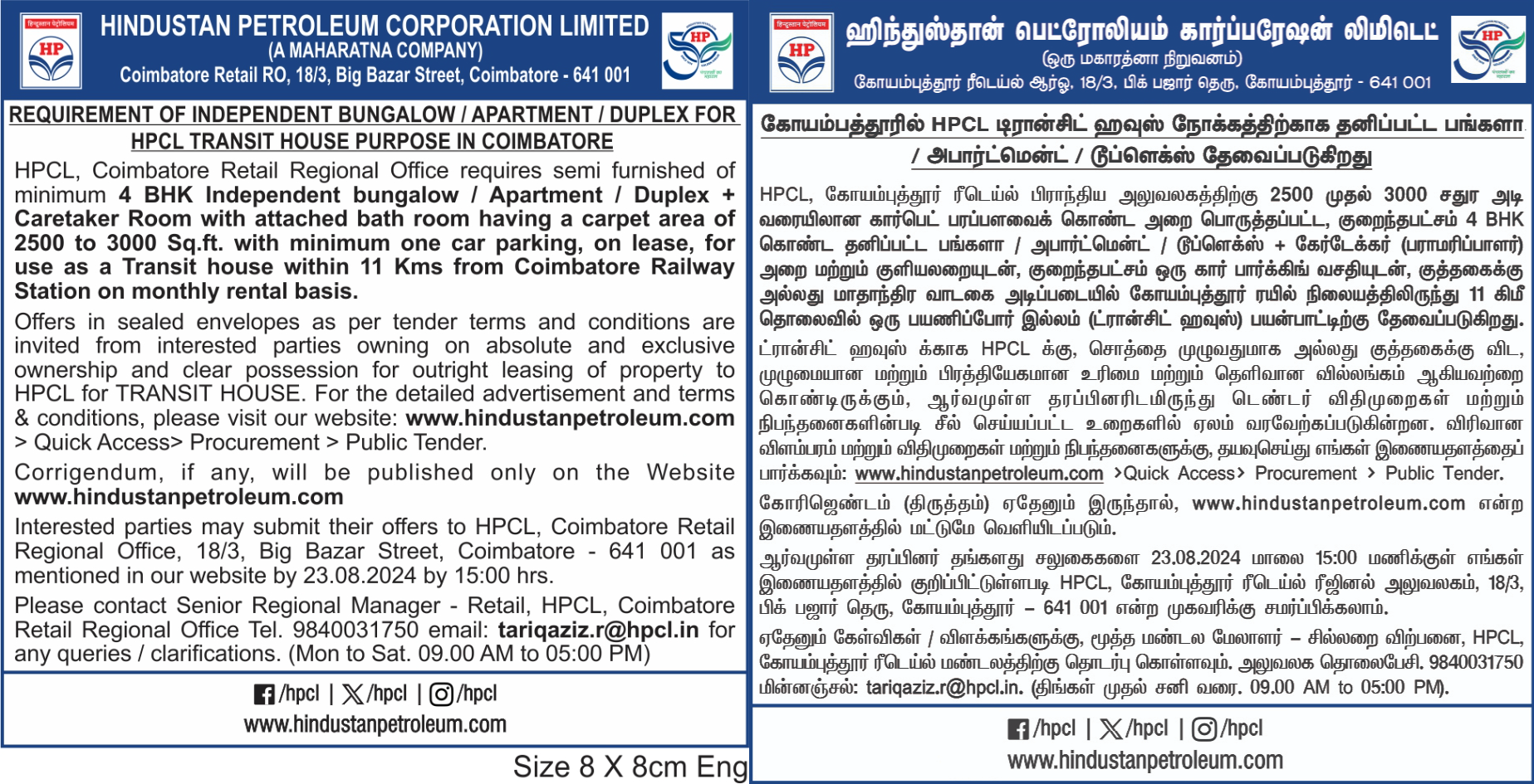 Tender for Leasing of Premises for Transit House at Coimbatore (Tender Submission Date: 23.08.2024) |