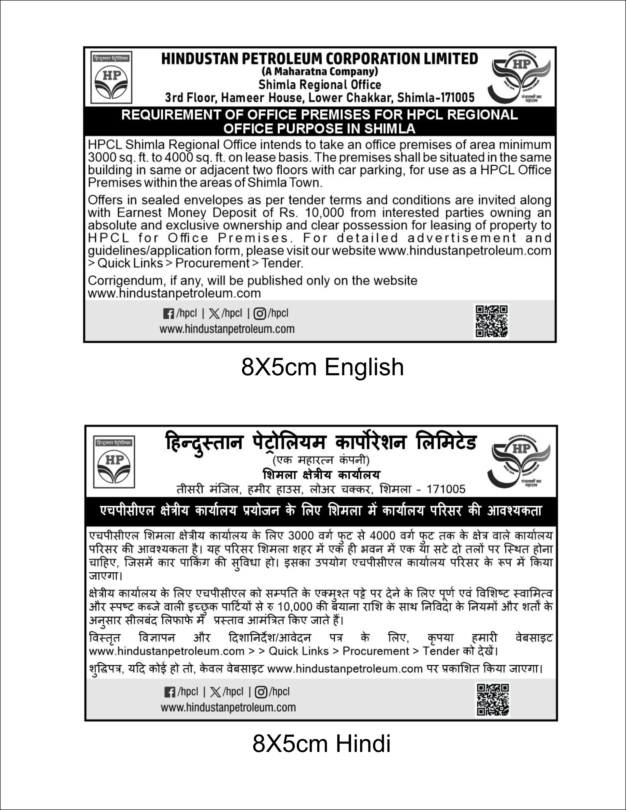| Tender for Leasing of Built-Up Premises for HPCL Regional Office in Shimla |